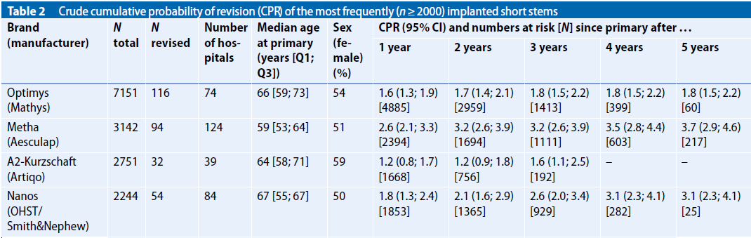 In assessing the performance of short stems according to the EPRD records, Steinbrück et al extracted data from 266,702 primary THAs conducted between November 1, 2012 and September 30, 2019. After selecting data sets with complete follow-up from clinics with information about their case load, 17,526 primary short-stem THAs were selected for further analyses. In the analyses, the authors stratified the data for four most frequently used short stems. As shown in Table 2, among these four stems, the 5-year cumulative probability of revision (CPR) for the Optimys stems was 1.8%—better than the Metha (3.7%) and the Nanos (3.1%) stems. The authors nevertheless cautioned the readers that, in the clinics where the short stems were used and the data were extracted from, the Optimys stems were more frequently used (40% of all THAs) than the Metha and the Nanos stems (15% and 26% of all THAs, respectively), therefore an "expertise bias" is possible [4].