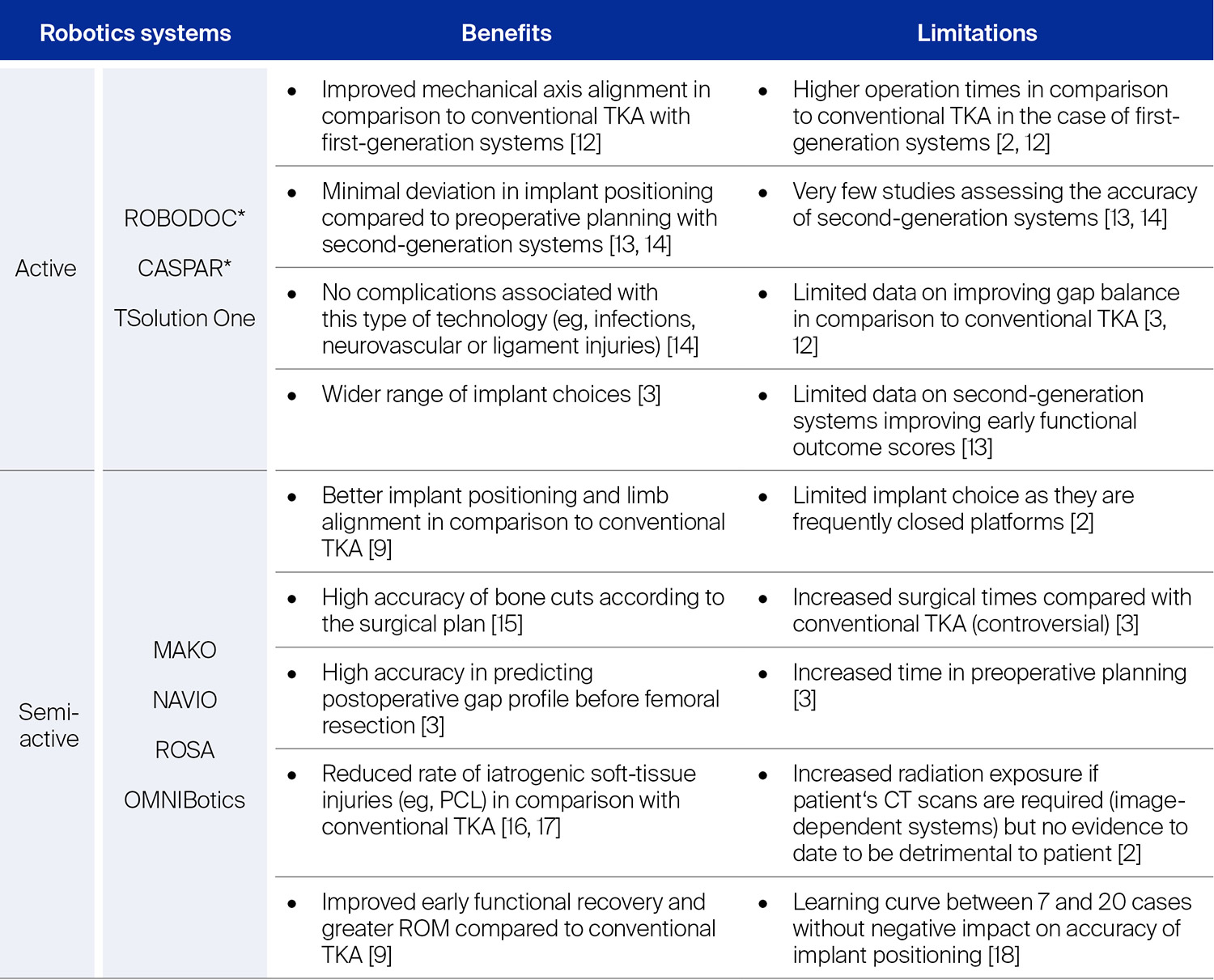 The term "robot" was initially coined in 1920 by the Czech science-fiction writer Karel Capek, who described artificially humanoids repeatedly performing labor tasks [2]. In the operating room, robots were initially designed to minimize human error while maximizing operative accuracy [3]. Since the first reported robotic-assisted total knee arthroplasty (raTKA) in the early 2000s [5], the surgical tasks performed by robotic-assisted surgery platforms have rapidly evolved. Currently, all robotic technologies use dynamic referencing to assess intraoperative knee stability, alignment, and range of motion (ROM) while adjusting bone resection, ligament balance, and position of the prothesis [2, 6]. Based on how bone resections are conducted, robotic-assisted surgery platforms can be either classified as "fully active" (ie, a robotic arm performs autonomously preprogrammed bone resections on the patient) or "semiactive" (ie, the surgeon performs bone resection within a predefined zone that has been set in the preoperative plan while receiving intraoperative feedback) [1, 3, 7]. Such systems normally include a haptic interface by which the surgeon receives information about the forces and stress exerted on articular surfaces and can adjust his/her movements intraoperatively. Preoperative computed tomography (CT) scans or magnetic resonance imaging (MRI) enables the surgeon to generate a virtual three-dimensional (3D) model of the patient-specific bony anatomy. The 3D virtual model is employed to preplan bone cuts, implant size, as well as positioning, and is subsequently mapped intraoperatively to the patient's bone anatomy using navigational trackers, in a process known as registration [8, 9]. Another type of semiactive systems are handheld robotic burrs, which are manually controlled by the surgeon. Instead of a haptic interface, the robot follows the navigation field's burring tool trajectory, controlling the speed and exposure of the device to protect against iatrogenic ligament injuries [3, 10]. Contrary to haptic systems, this type of semiactive system is imageless (ie, it is not based on CT/MRI scans) and compatible with a wide range of prosthetic implants and brands [2, 10, 11]. Each robotic device is associated with several benefits and limitations (Table 1). While semiactive systems are the most frequently used today, the appearance of second-generation fully active systems might change the orthopedic landscape in the near future.