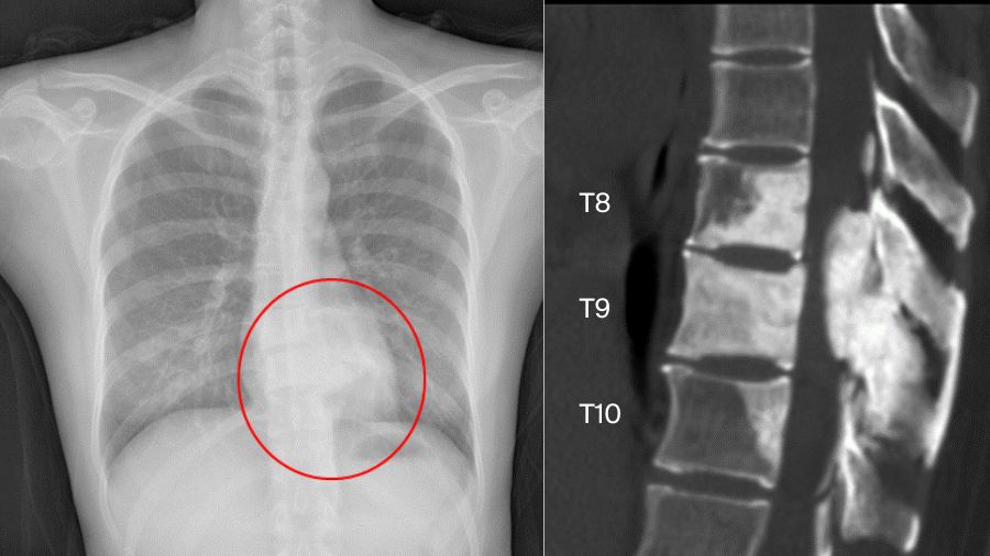 But sometimes things are more complicated. Another case involved a 33-year-old female. The chest X-ray examination found an osteogenic spinal lesion. The CT scan showed osteolytic lesions of T9 left vertebral body, facet joints and rib, with extensive reactive bone formation.