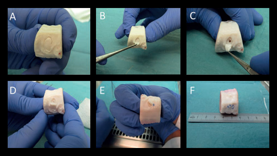 Annulus fibrosus defect organ culture model. A and B, cutting of operation window; C, creating of the defect through the AF and partial NP using a biopsy punch; D, filling of the defect with biomimetic hydrogel and/or functional cells; E and F, suturing of the operation window.