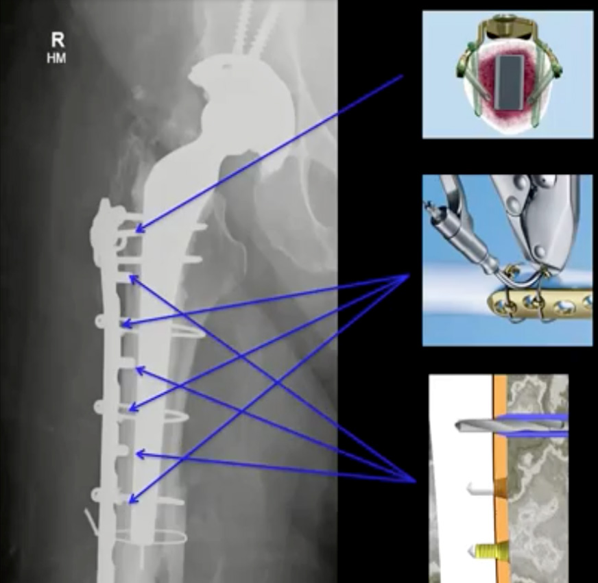 After the plate is fitted to the contours of the femur and roughly in place, cerclage wires can be inserted around the femur. This requires using curved trocars to encircle the femur, then feeding cerclage wire through. Minimally invasive techniques such as this shorten operative time, reduce bleeding and minimize fracture exposure. In the diagram above, the upper-right illustration shows how variable-angle screws can be oriented both to maximize the implant’s stability and to screw beside the implant stem.