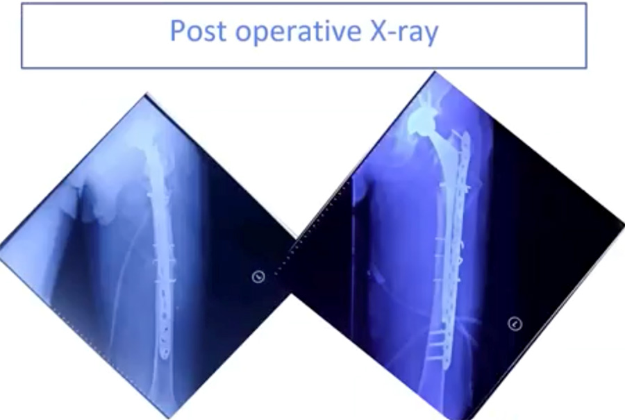 After ORIF using minimally invasive plate osteosynthesis (MIPO) techniques, the patient’s post-operative x-rays (below) show a well-reduced fracture with a stable implant, the stem of which extends well past the fracture site. To optimize conditions for fracture healing, the new stem should extend at least two femoral diameters past the fracture or defect.