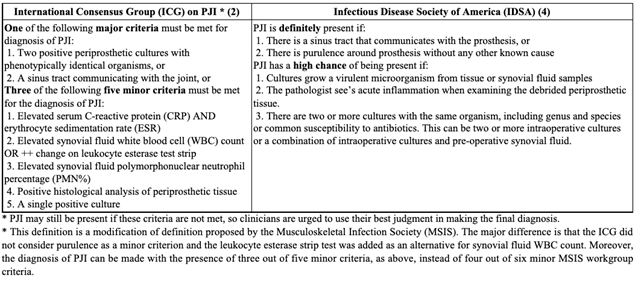 The International Consensus Group offers a similar set of criteria. While their major criteria are that same as those of the MSIS, their scoring system is simpler: The presence of any three of the five minor criteria indicates an infection. 18