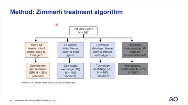 Where infection is present, a combination of debridement, antibiotics, and implant retention (DAIR) is recommended. Following Zimmerli’s algorithm (below), for infections more that 3 weeks old, a multi-stage approach may also be necessary. In some cases, the only possibility is a salvage operation.