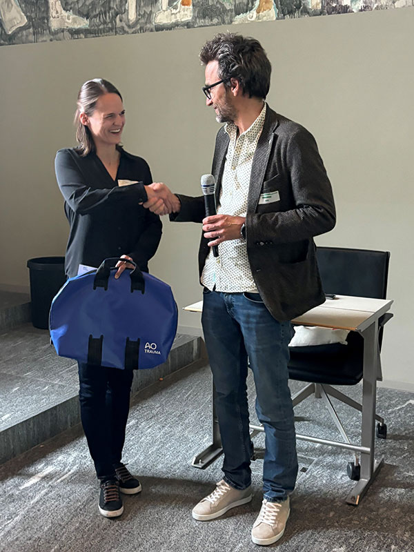 Once again, we awarded the AO Trauma Switzerland Science Award this year. Research works from Swiss clinics in the field of traumatology are eligible for nomination. The board selected three papers, which were presented by the authors. Subsequently, attendees voted for the best paper. Kerstin Bütler from Chur emerged as the recipient of this year's AO Trauma Switzerland Science Award, receiving CHF 1000 for her publication: "Clavicular hook plate versus dog-bone technique for acute high-grade acromioclavicular joint dislocation: a retrospective cohort study comparing clinical outcome scores, complications, and costs," published in the "Archives of Orthopedic and Trauma Surgery" in April 2023.