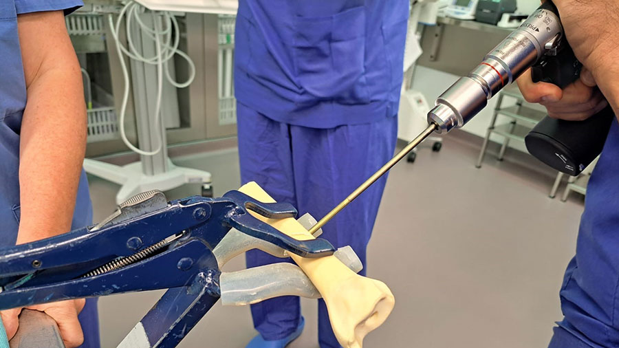 Der theoretische Teil wurde durch einen Besuch im hochmodernen OP-Trakt des KSGR ergänzt, der eigens für diesen Anlass zur Verfügung gestellt wurde. Hier hatten die Teilnehmer die exklusive Gelegenheit, sich mit den vom KSGR bereitgestellten hochentwickelten Repositionsinstrumenten vertraut zu machen. Besonders hervorzuheben ist die praxisnahe Einführung in den Umgang mit dem großen Distraktor, den die Teilnehmer selbstständig montierten. Parallel dazu fand in einem weiteren OP-Saal ein praxisorientiertes Training zur Lagerung am Extensionstisch und zur vertikalen Abdeckung statt, bei dem die Teilnehmer ihre Fertigkeiten vertiefen und in intensiven Diskussionen erweitern konnten.