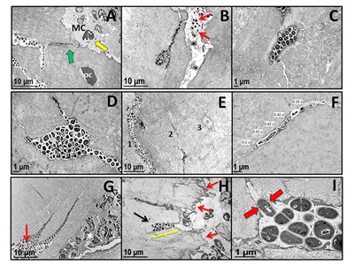 Figure 1. TEM evidence of submicron-elongated S. aureus in the osteocytic lacunar-canaliculi network of infected live bone tissue. (A-F, H, I) Long bones from mice (n = 5) infected with a UAMS-1-contaminated tibial pin or (G) a USA300-infected femoral osteotomy were harvested on day 14 post infection for TEM. (A) Low magnification TEM image (x 4,000) of UAMS-1 invasion of live bone tissue (note osteocyte OC) in a canaliculus (green arrow) communicating with the marrow cavity (MC). Also note the proximal neutrophils (yellow arrow) within the marrow. (B) Low magnification TEM image (x 4,000) of UAMS-1 invasion of an osteocytic lacunar canaliculus adjacent to a channel infected with S aureus (arrows) containing necrotic cells (*). Higher magnification TEM images (C: x 8,000; D: x 10,000) of UAMS-1 colonization of osteocytic lacunae. (E) Low magnification TEM image of three parallel canaliculi in various states of colonization (1: severely infected; 2: moderately infected, and 3: uninfected) by the invading UAMS-1 within the live cortical bone (x 3,500). (F) Higher magnification TEM image measuring submicron-elongated UAMS-1 (x 15,000). (G) Similar bacterial invasion of canaliculi adjacent to the osteotomy (red arrow) and neutrophils in the marrow cavity (*) were observed in USA300-infected femurs (x 4,000) but not in long bones that received sterile implants (data not shown). (H) Low magnification TEM image (x 4,000) documenting cortical bone damage adjacent to the infected tibia pin (red arrows) and a cavity filled with UAMS-1 (yellow bracket) that leads to a canaliculus (black arrow). (I) High magnification TEM of the infected cavity in H demonstrating mitotic S. aureus in the live cortical bone (x 25,000). Note that only the bacterium entering the canaliculus has an asymmetric septal plane (red arrows), which is aligned perpendicularly with the canaliculus orifice, perhaps to anchor and propel the emerging daughter cell into the submicron channel in the cortical bone during binary fission.Figure 2. Immunoelectron microscopy (IEM) evidence of proliferating submicron-elongated S. aureus at the leading edge of canalicular invasion. Mice (n = 5) received a femoral osteotomy which was infected with S. aureus (UAMS-1), fed BrdU in their drinking water every day of the infection and their femurs were harvested on day 14 post-operation for IEM. (A) Light microscopy image (x 4) of the toluidine-blue-stained cortical bone section containing a 0.125 mm microcrack colonized with S. aureus up to the leading edge (arrow), which was interrogated by IEM. (B) Low (x 15,000), (C) high (x 40,000), and (D) ultrahigh (enlarged from 150,000 original) magnification IEM images of BrdU-positive S. aureus at the leading edge of the colonized canaliculus. (C) Note the rod-shaped bacterium with a diameter of 0.36 µm at the leading edge of bacterial infiltration and the immuno-gold labeled chromosome (12 nm black dots in D) confirming BrdU incorporation. IEM on S. aureus-infected femurs from mice that were not fed BrdU were all negative for immuno-gold labeling (data not shown).