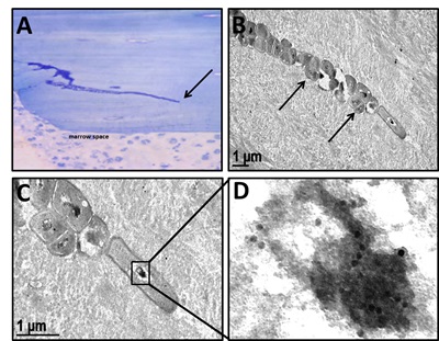 Transmission electron microscopy (TEM) was utilized to examine the bones of mice with implant-associated S. aureus chronic osteomyelitis. While examining thin (70 nm) bone sections at high magnification, it was observed that some bacteria were able to change shape and squeeze into submicron spaces called canaliculi. The study documented how round bacteria become rod-shaped to accommodate the canaliculi submicron diameter space. These bacteria propagate deep into bone, infecting osteocytes. Because bone is an immune-privileged tissue, bacteria are protected from treatment with traditional antibiotics delivered through blood vessels.