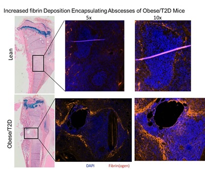 Using our model of orthopedic-implant-associated infection in the obese/T2D mice, expression of four genes coding for S aureus surface proteins was found to be markedly elevated in obesity/T2D. All code for cell surface fibrinogen-binding proteins: clfA (34-fold), bbp (42-fold), sdrC (48-fold), and clfB (19-fold) (Farnsworth et al, 2017b). Obesity and diabetes are known to be hypercoagulable states (Kannel et al, 1990; Yarmolinsky et al, 2016). Increases in fibrinogen and plasminogen activator inhibitor-1 (PAI-1) and activation of several clotting factors are well documented. It has been argued that these changes contribute to the increased risk of cardiovascular events and stroke in this population. Thus, it is very intriguing that S. aureus expresses markedly higher levels of fibrinogen-binding proteins in the obese/T2D host. Importantly, our most recent data show that our mouse model replicates the hypercoagulable state of obese/T2D patients. Additionally, S. aureus abscesses in the medullary canal following implant infection are encapsulated by a more prominent fibrin structure in the obese/T2D mice (Figure).