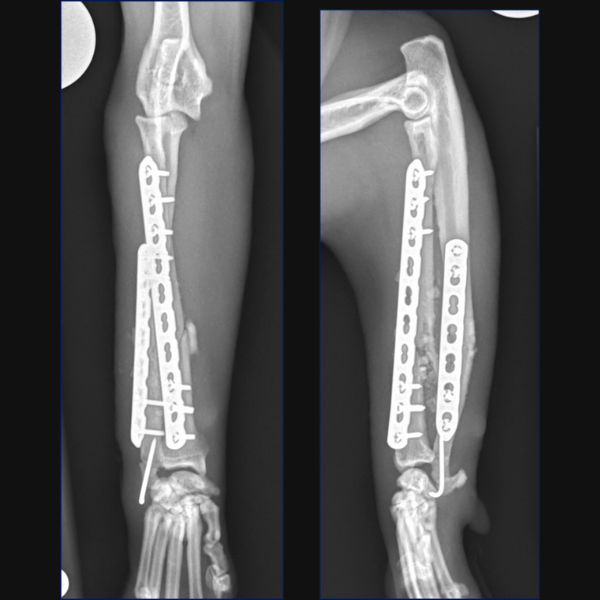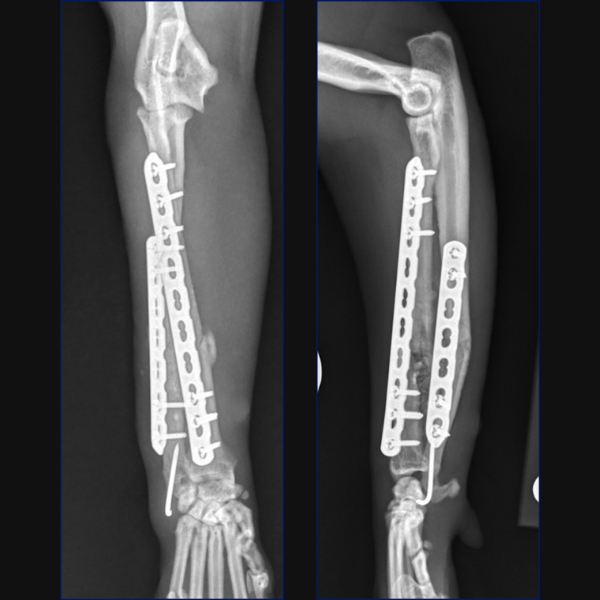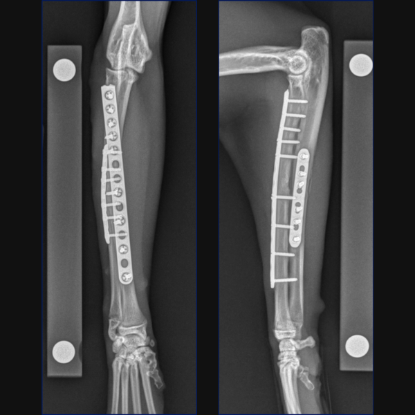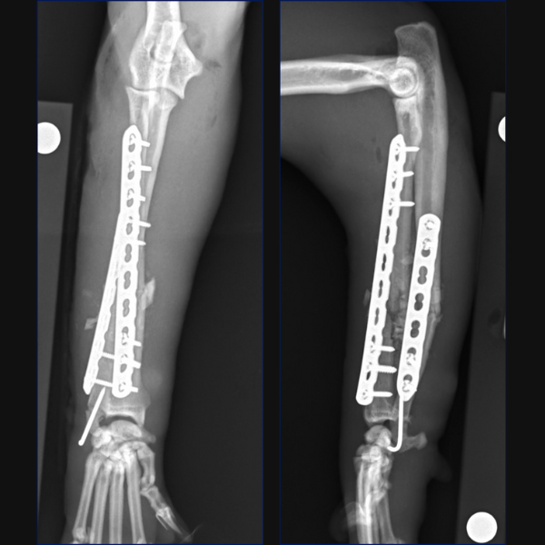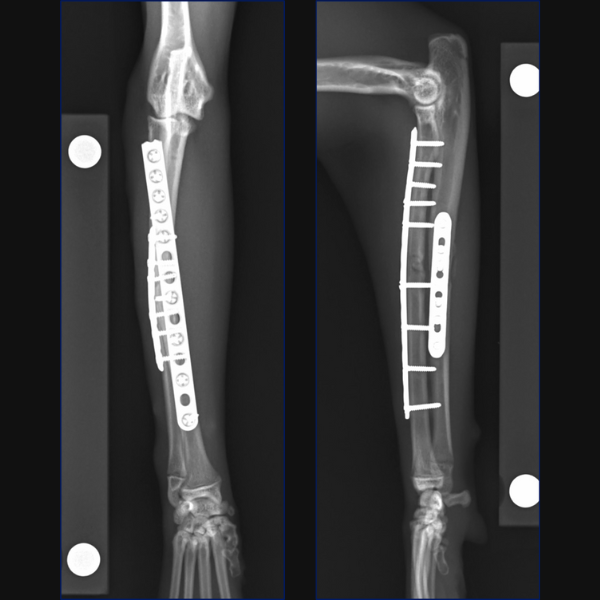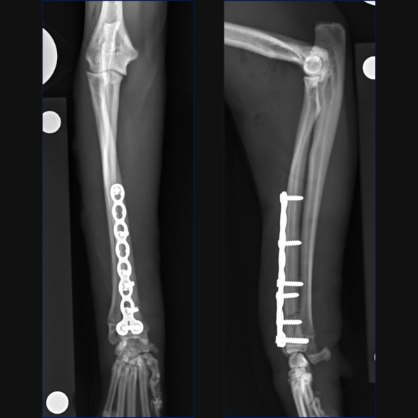 For Bundle we performed open reduction and internal fixation using a 14-hole 1.5/2.0 Veterinary Cuttable Plate (VCP) on the radius and a 6-hole 1.5mm Locking Compression Plate (LCP) on the ulna. This was all performed through single craniolateral approach. I think we have addressed one reason why we chose dual bone fixation in this case, due to the lower complication rate that could be anticipated with that. Another reason is that in people at least, insufficient stabilization has been associated with an increased risk of synostosis formation so rigid, dual-bone fixation was desired here to limit that. But why choose a lateral plate on the ulna rather than an IM pin?