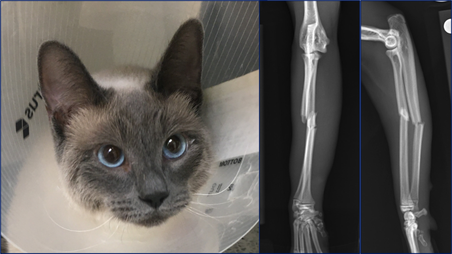 I would like to start by discussing case considerations for the first case which is Bundle, a one-year-old female spayed Siamese cat. She presented with an acute onset of non-weight bearing left forelimb lameness after playing with her sibling. On orthopedic examination she had instability upon palpation of the left antebrachium, with associated swelling and crepitus.