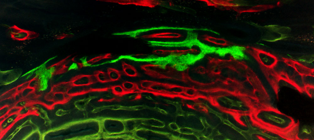 CD31 immunohistochemical stain showing a blood vessel, of a decalcified, cryosectioned coracoclavicular ligament