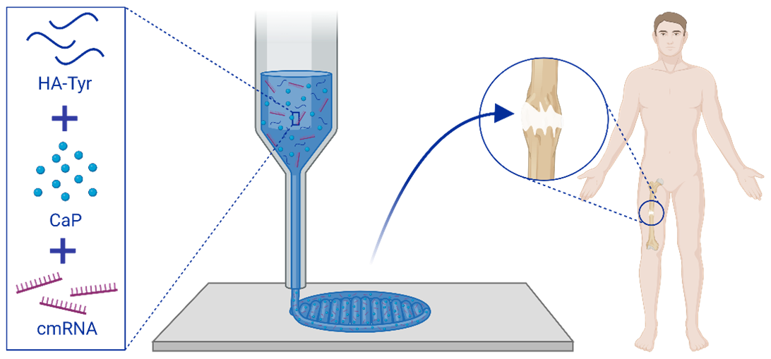 In this project a 3D-printable bone mimetic composite biomaterial-ink for bone regeneration is developed. This ink combines osteoinductive calcium phosphate particles (CaP) with tyramine modified hyaluronic acid (HA-Tyr) for the delivery of chemically modified RNAs (cmRNAs), to induce nerve, vessel, and bone formation (Figure). To achieve this aim, Semaphorin 3A (SEMA3a), Vascular endothelial growth factor (VEGF), Platelet-derived growth factor (PDGF-BB) and Bone Morphogenetic Protein-7 (BMP-7) cmRNAs targeting neurogenesis, vasculogenesis and osteogenesis will be synthesized, and delivered using vectors based on lipids and polysaccharide nanocapsules. A 3D printed HA-Tyr-CaP biomaterial-ink, that is customized to patient specific defect sites, will be loaded with the cmRNAs-vectors to release them and induce intrinsic osteoinductivity and guide sensory neurons and endothelial cells ingrowth for bone regeneration.