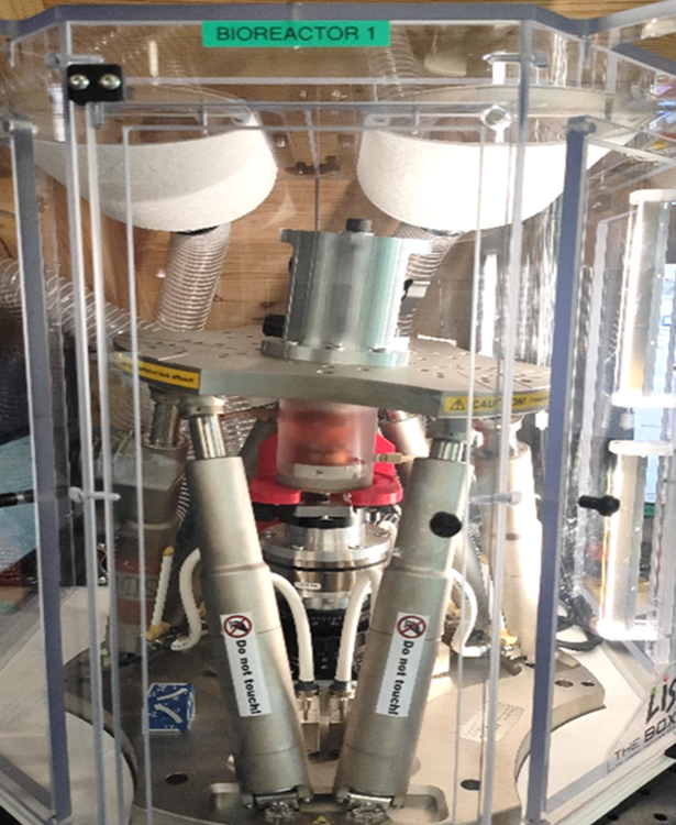 We have established whole IVD organ culture systems with the ability to maintain entire discs for several weeks under controlled nutrient and mechanical loading conditions. Our unique multiaxial bioreactors enable us to apply load and motion in six degrees of freedom onto the spinal segment, reproducing physiological conditions.