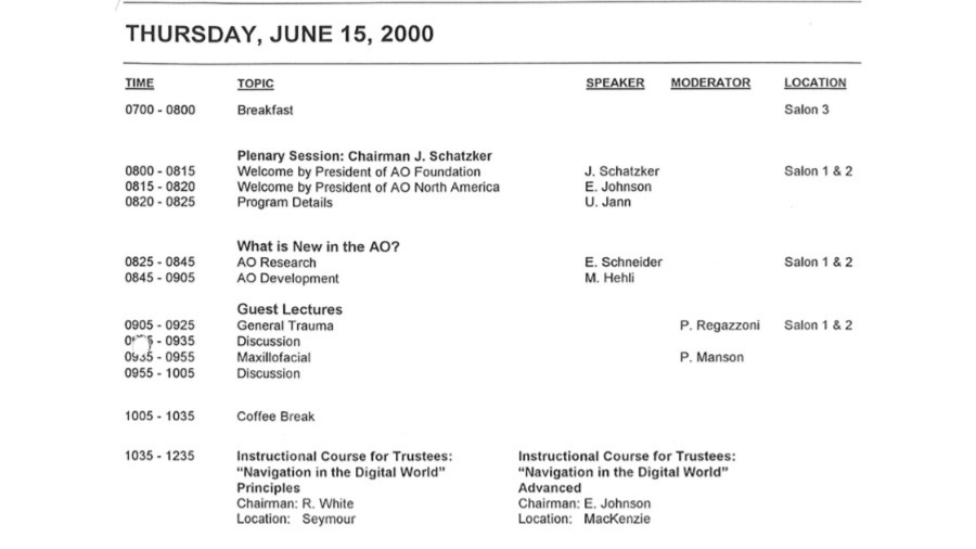 The AO Trustees Meeting program hasn't changed much over the years; why change a tried- -and-true format? The meeting still opens with a welcome session by the AO president, followed by updates from various AO entities. In 2000, one item on the agenda caught the eye: a course for trustees on how to navigate in the digital world.