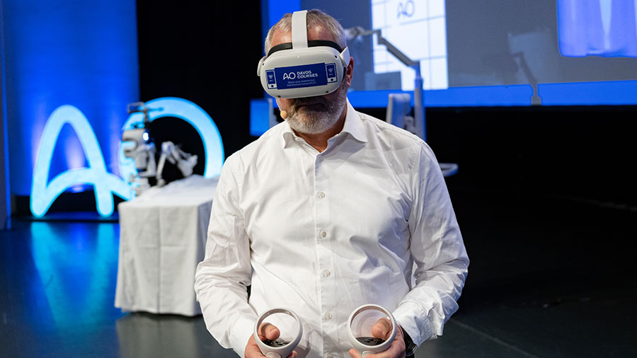 The AO Davos Courses 2022 opened last night, December 4, 2022, with a rousing welcome from AO President Florian Gebhard, who received a crowd of participants, faculty, industrial partners, and special guests at the Davos Congress Centre. Gebhard walked on stage with a pair of virtual-reality goggles and segued into his presentation about the digital future of surgery with cutting-edge tools and education.