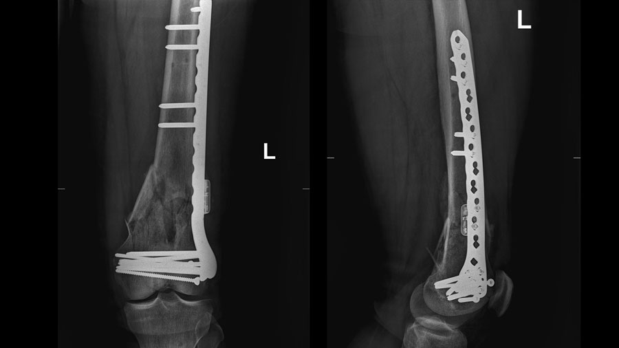 Attached to a DePuy Synthes Variable Angle LCP™ Curved Condylar Plate and implanted by BG Unfallklinik Tübingen orthopedic trauma surgeon Benedikt Braun on October 2, 2023, the AO Fracture Monitor has since been continuously monitoring the healing of a 61-year-old German patient who sustained a significantly comminuted fracture in a three-meter fall from a ladder.