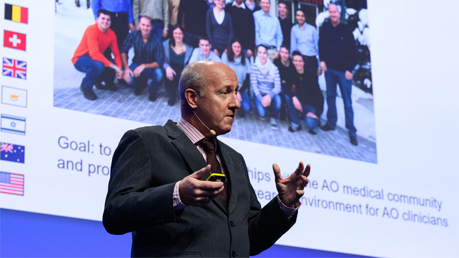 In his keynote address, Pohlemann shared his AO journey—beginning with when he first encountered the AO in 1983 through the AO’s Manual of Internal Fixation (Manual der Osteosynthese) when he was a resident preparing for a rotation in trauma surgery. This book, authored by AO founders Maurice Müller, Martin Allgöwer, Robert Schneider, and Hans Willenegger, is internationally known as the go-to book for osteosynthesis specialists. Through this book, Pohlemann learned about the influence of mechanics on biological processes and the art and aesthetics of fracture reconstruction. That was just the beginning of a lifelong relationship with the AO for Pohlemann, who took advantage of the AO’s opportunities to grow a network built upon teamwork, friendship, and collaboration, culminating with his current presidency.Pohlemann then dialed further back in time to the AO’s historic beginnings, to its founding on November 6, 1958, when 13 visionary surgeons (including the authors of the Manual of Internal Fixation) gathered in Biel, Switzerland, to establish the AO. The AO’s founding principles revolutionized fracture management through four key pillars: soft-tissue preservation, fracture fixation, fracture realignment, and early mobilization.